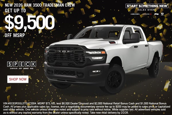 *All prices plus applicable sales tax, license, and a negotiable documentary service fee up to $200 may be added to sales price or capitalized cost of the vehicle. One vehicle unless otherwise noted and subject to prior sale without notice. While supplies last. All advertised vehicles sold as-is without any implied warranty from the dealer unless specifically noted. Price Expires Today. Courtesy Transportation Vehicles have more miles than a normal retail unit. MPG estimates on this website are EPA estimates; your actual mileage may vary. For used vehicles, MPG estimates are EPA estimates for the vehicle when it was new. The EPA periodically modifies its MPG calculation methodology; all MPG estimates are based on the methodology in effect when the vehicles were new (please see the Fuel Economy portion of the EPA's website for details, including a MPG recalculation tool). For more information on America's Best Warranty, click here. By adding a mobile phone number to your submission, you confirm you are the owner and/or primary user of the mobile phone number provided, you agree to our Privacy Policy, and you agree to receive marketing calls and/or text messages from Speck Chrysler Jeep Dodge Ram at the phone number provided. This is not a condition of any purchase. Message and data rates may apply. You may text STOP to 509-652-2294 to opt out of texting at any time.